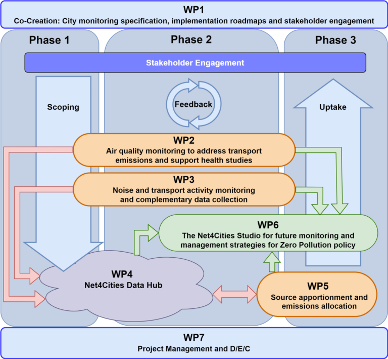 The transport sector is a major contributor to environmental degradation, including air and noise pollution that have negative effects to ecosystems and human health. This is particularly critical in urban areas, where the confluence of transport emissions and high population density result in adverse health impacts and substantial economic burden. The upcoming changes in the transport sector will be critical to reach targets set by the EU Green Deal. The Zero Pollution Action plans are essential tools to reduce pollution at many different levels. Through co-creation with stakeholders Net4Cities will facilitate the realization of the zero-pollution vision by 2050. The backbone of Net4Cities is this transdisciplinary approach in which the consortium members will engage with the partner cities, including ports and airports, to jointly produce new knowledge, and ensure relevance, uptake, and maximize transferability and exploitation.